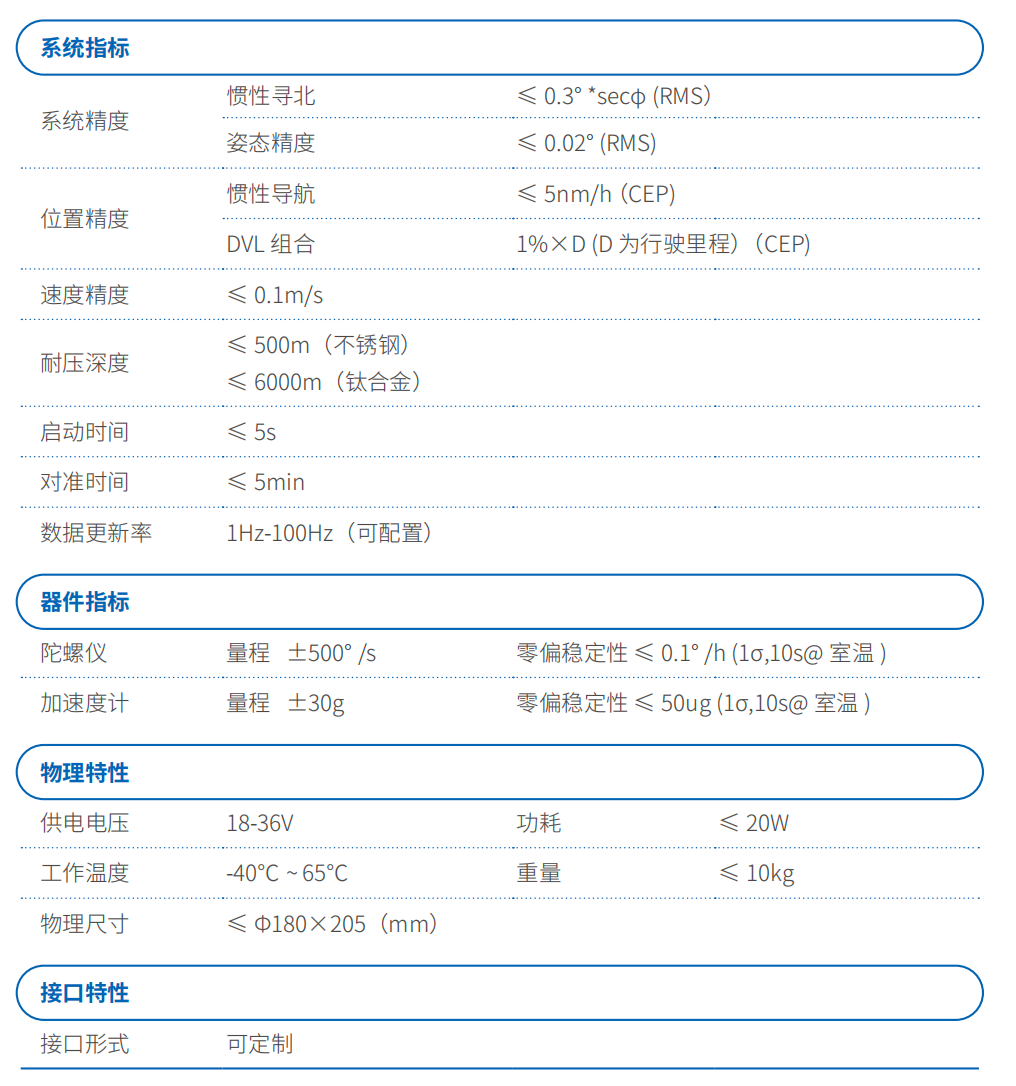 產(chǎn)品搭載全新的導(dǎo)航融合算法,提供慣導(dǎo) +DVL 緊密耦合解決方案,結(jié)合了公司最新的導(dǎo)航技術(shù),提供可擴(kuò)展的各種組合方案,其性能和特性可為各種水下設(shè)備提供高精度導(dǎo)航信息。